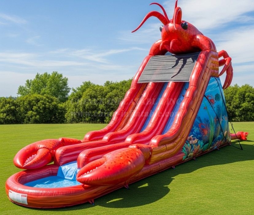 Make a splash with this giant lobster-themed inflatable water slide. Featuring twin sliding lanes, claw-shaped splash pool and vibrant underwater murals, it delivers high-impact visuals and endless fun for parks, events and rentals. Built from heavy-duty PVC with safety netting and easy setup, this eye-catching water attraction combines durable construction with striking design for unforgettable summer entertainment.