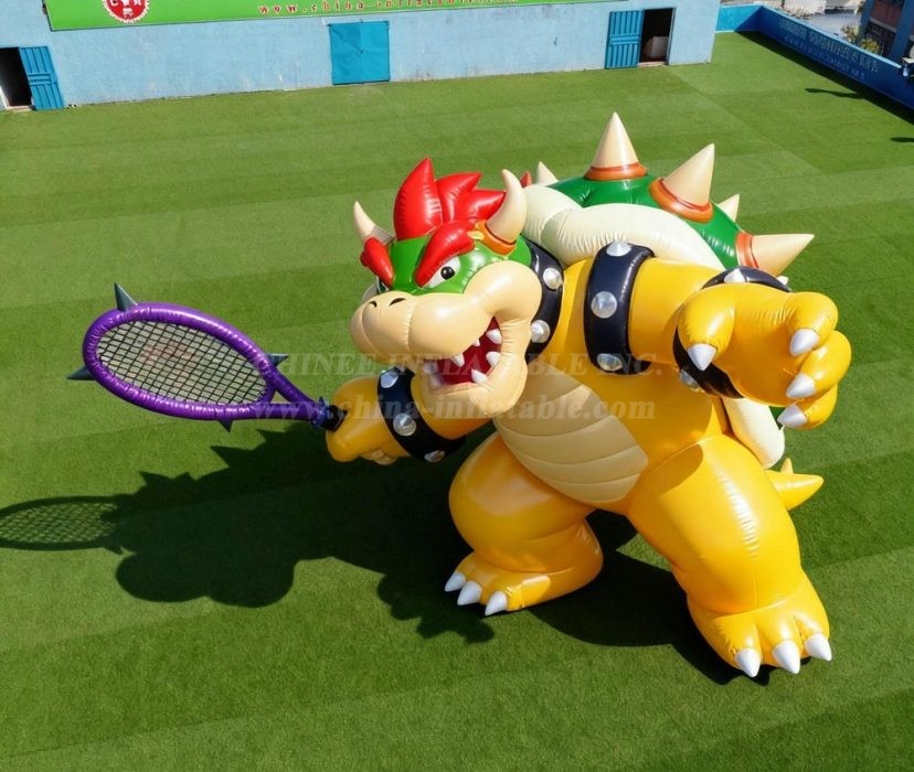 Bring the iconic villain from the Super Mario universe to life with this impressive inflatable Bowser tennis character! This giant inflatable cartoon figure features the beloved antagonist Bowser in his classic orange and yellow design, complete with his signature spikes, horns, and menacing expression. What makes this inflatable truly special is the tennis theme - Bowser is shown holding a detailed purple tennis racket, making it perfect for sports events, tennis tournaments, or Super Mario-themed parties.