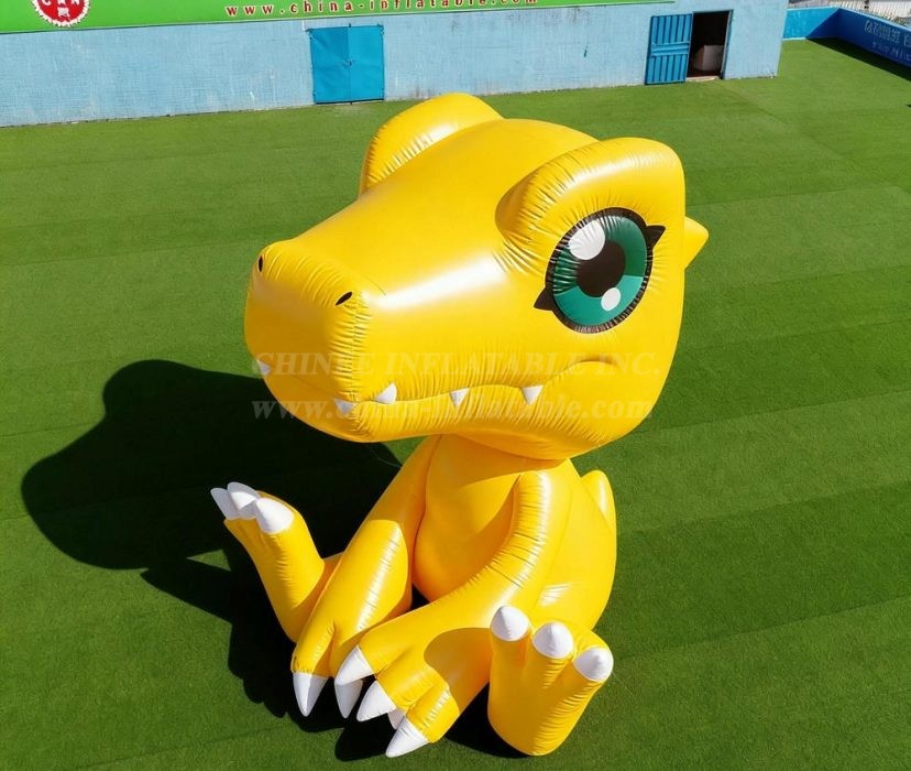Bring prehistoric excitement to your event with the Cartoon3-055 Yellow T-Rex Dinosaur Inflatable! This adorable bright yellow T-Rex sits proudly with its friendly expression, large sparkling green eyes, and charming white teeth that will captivate children and adults alike. Perfect for dinosaur-themed parties, educational events, or as an eye-catching promotional display.