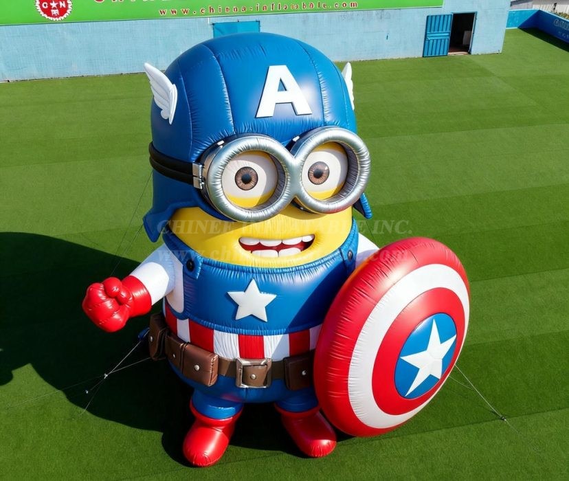 This high-quality inflatable cartoon features the classic Minion yellow body with Captain America's signature blue uniform, complete with the star emblem, his famous red, white, and blue shield, and even the characteristic helmet with wings. The attention to detail is remarkable, from the Minion's signature goggles and cheerful smile to the authentic Captain America accessories.