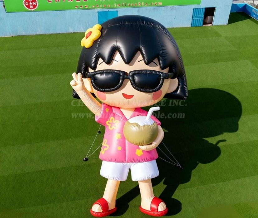 Bring tropical vibes to your next event with this charming Cartoon3-205 Summer Girl with Sunglasses inflatable cartoon! This delightful decorative inflatable features an adorable cartoon girl character complete with stylish black sunglasses, flowing black hair with a cute yellow hair accessory, and a beautiful pink floral Hawaiian-style top paired with crisp white shorts and red sandals.