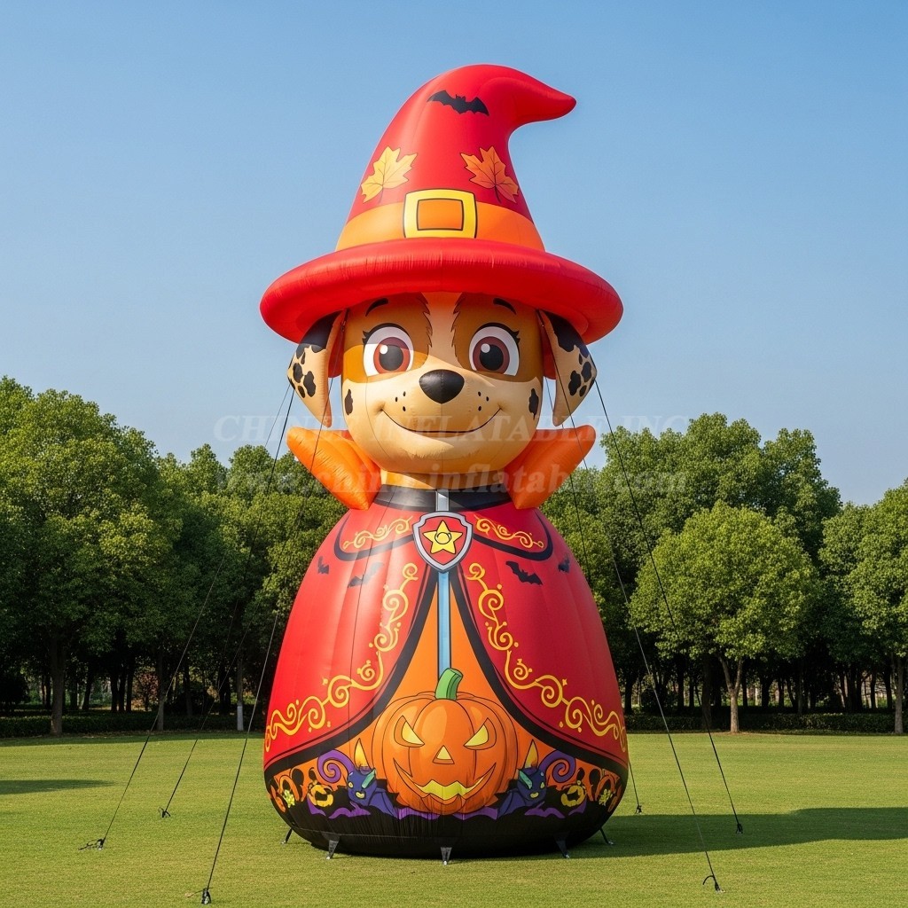 Bring seasonal magic to your event with the Cartoon3-293 Halloween Dog Inflatable Cartoons display from Chinee Inflatables. This towering character features a friendly pup dressed in a festive wizard hat and cloak, complete with autumn leaves, bats, and a smiling jack-o’-lantern motif. Designed as a decoration piece (not for bouncing), it’s perfect for drawing attention at community festivals, school fairs, pumpkin patches, shopping centers, or photo zones at themed parties.