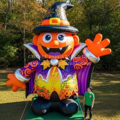 Make your seasonal display unforgettable with the Cartoon3-360 Halloween Wizard Inflatable Cartoon from Chinee Inflatables. This towering character features a friendly orange face with fangs, a classic pointed hat detailed with spiderweb graphics, and a vibrant robe accented with pumpkins, lightning, and purple capes—instantly signaling Halloween fun from a distance. Designed as a decorative showpiece (not for bouncing or sliding), it’s perfect for entrances, photo zones, parades, school fairs, shopping centers, community festivals, and themed promotions.