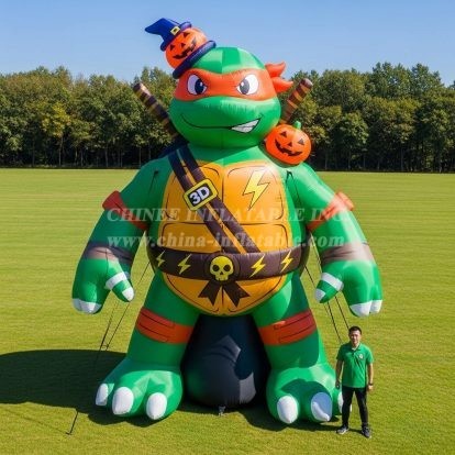 Make a bold statement at your next event with our Cartoon3-402 Ninja Turtle-inspired Inflatable Cartoon. Standing impressively tall, this 3D character features bright green armor plating, a utility belt, twin training swords across the back, and festive jack-o’-lantern accents for a fun Halloween vibe. Designed as a decoration piece (not for bouncing), it’s perfect for entrances, photo ops, and branding spots at fairs, promotions, school festivals, and theme parties.
