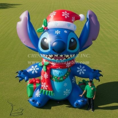 Bring instant holiday cheer to your venue with the Cartoon3-676 Lilo & Stitch Christmas Inflatable Cartoon from Chinee Inflatables Inc. This oversized display features the beloved blue character dressed in a festive Santa hat and scarf, sprinkled with snowflake graphics and wrapped gifts for a joyful seasonal touch. Designed purely for decoration, this inflatable is perfect for malls, town squares, theme parks, photo spots, and corporate events where a striking visual centerpiece is needed.