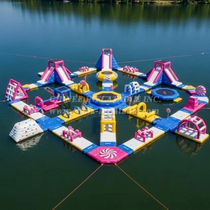 Turn your lake or beachfront into a headline attraction with the S320 Candy Theme Inflatable Water Park. This vivid, confection-inspired floating course features multiple slides, climbing walls, balance beams, trampolines, hurdles, and arched gateways linked by stable walkways to create a thrilling loop. Guests can sprint, climb, bounce, and splash their way through candy-striped towers and lollipop accents, making it perfect for high-capacity fun and photo-ready moments.