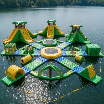 Turn your lake, resort, or waterfront into a headline attraction with the S325 Jungle Theme Water Park from Chinee Inflatables. This modular floating playground blends vibrant tropical styling with a full range of action features to keep guests moving, laughing, and returning for more. Multiple tower climbs lead to thrilling slides that splash down into the water, while linked balance paths, crawl tunnels, and climbing walls create endlessly reconfigurable challenge routes for every age group. Central jump pads add an exciting rebound element and make the park a lively hub of activity.