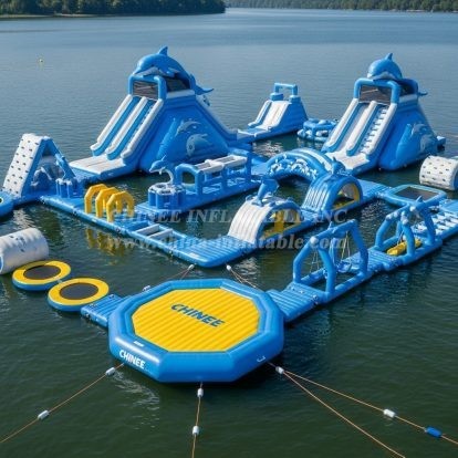 Make a splash with the S331 Dolphin Theme Water Park by Chinee Inflatables Inc., a sprawling floating adventure course designed for lakes, beaches, and resorts. This multi‑module aqua park blends towering slides, climbing walls, balance beams, tunnels, and jump pads into one continuous circuit, all styled in bright ocean blues with friendly dolphin accents. Guests can scale the climbing ramps, zip down wide slides, dash across balance logs, weave through arch tunnels, and test agility on stepping pads before launching into the water for a refreshing finish.