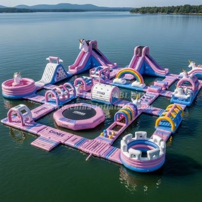 Bring dazzling fantasy to the waterfront with the S360 Unicorn Theme Water Park from Chinee Inflatables Inc. This large-scale floating aqua adventure blends multiple slides, crawl-through arches, balancing paths, hop pads, and a central jump zone into a single modular layout designed for nonstop fun. Graceful unicorn figures, pastel rainbows, and soft color blocking create a photo-worthy attraction that draws families from the shoreline at first glance.