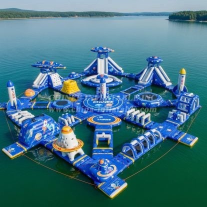 Launch big summer revenue with the S376 Space Theme Water Park from Chinee Inflatables. This modular floating attraction transforms any lake, reservoir, or calm waterfront into a futuristic space base packed with slides, climbs, jumps, and balance challenges. Designed around a striking interstellar aesthetic—complete with rockets, UFO-style platforms, and a Saturn‑ring spinner module—the course invites guests to explore, race, and play across multiple interconnected stations.
