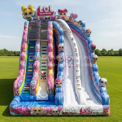 Make your next event pop with the T8-8750 L.O.L. Surprise Inflatable Slide from Chinee Inflatables Inc. This eye‑catching dry slide showcases beloved L.O.L. Surprise doll artwork from top to bottom, wrapped in vibrant pinks, blues, and rainbow accents that instantly attract kids and families. A wide, non-slip climbing lane with color-coded footholds leads to a tall platform protected by safety netting, then drops into dual slide lanes for fast, thrilling rides and excellent throughput at busy parties and festivals.
