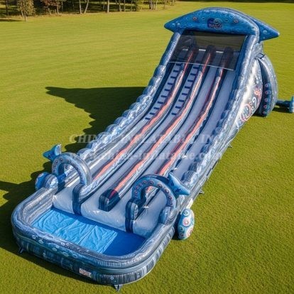 Make a splash with the T8-8985 Dolphin Inflatable Water Slide from Chinee Inflatables! Featuring dual sliding lanes and vibrant dolphin arches, this ocean-themed giant guarantees hours of fun for all ages. Built with top-quality materials, it offers durability and safety while delivering thrilling rides. Perfect for parties, resorts, and water events, this slide transforms any space into a seaside adventure. Bring the excitement of the ocean to your venue with this stunning inflatable water slide.