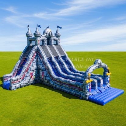 Experience the thrill of medieval adventure with this imposing Knight Giant Slide. Designed as a majestic castle with stone walls, flags, shields, and knight helmets, it offers dual sliding lanes for double the fun. Perfect for outdoor events, this inflatable combines castle charm with exciting play, creating unforgettable moments for kids and families alike.