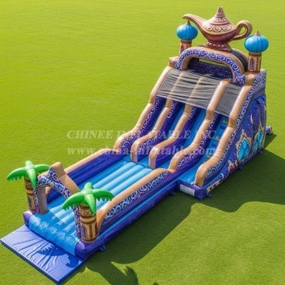 Dive into a magical adventure with the Aladdin Inflatable Water Slide. Featuring vibrant palace-inspired artwork and playful palm tree, this water slide offers thrilling fun while sparking imaginations. Perfect for outdoor summer events, it safely entertains kids as they slide and splash in style.