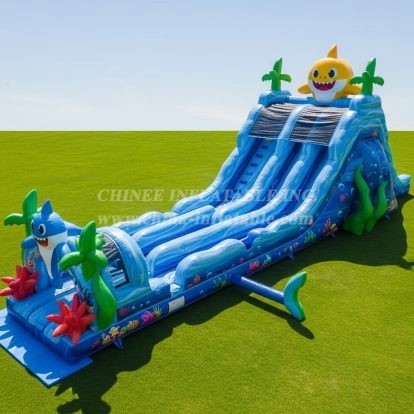 Dive into fun with this vibrant Baby Shark Inflatable Water Slide! Designed with bright ocean-themed graphics and playful characters, it thrilling dual slide lanes and splash zones for endless water excitement. Perfect for outdoor summer parties, this safe and durable inflatable guarantees hours of aquatic adventure for kids and families alike.