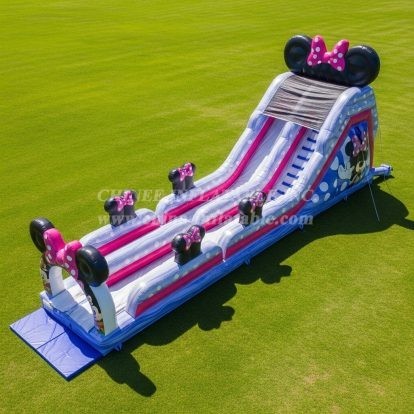 Bring magical fun to any outdoor party with this large Mickey & Minnie themed inflatable water slide. Featuring vibrant colors, iconic Minnie ears and bows, and double sliding lanes, it promises thrilling rides for kids. Perfect for summer events, this eye-catching inflatable combines water play with beloved Disney characters for hours of splashy excitement