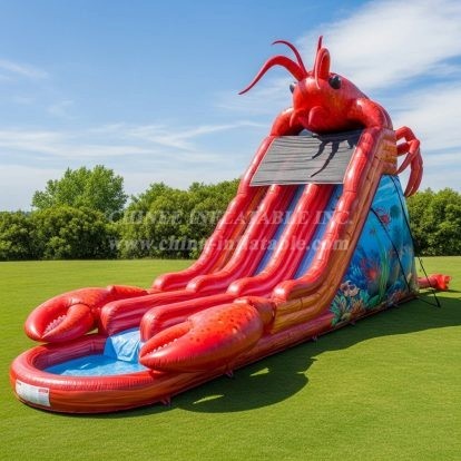 Make a splash with this giant lobster-themed inflatable water slide. Featuring twin sliding lanes, claw-shaped splash pool and vibrant underwater murals, it delivers high-impact visuals and endless fun for parks, events and rentals. Built from heavy-duty PVC with safety netting and easy setup, this eye-catching water attraction combines durable construction with striking design for unforgettable summer entertainment.
